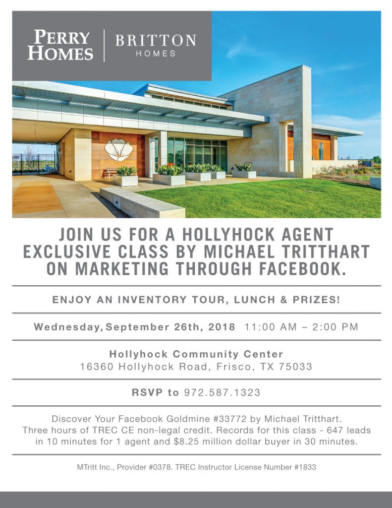 Hosted by Britton Homes in Frisco, Texas Thursday, September 26th 10:00 pm - 1:00 pm Discover Your Facebook Goldmine This workshop will train agents on how to properly engage potential clients … Continue reading Discover Your Facebook Goldmine [Frisco, TX]