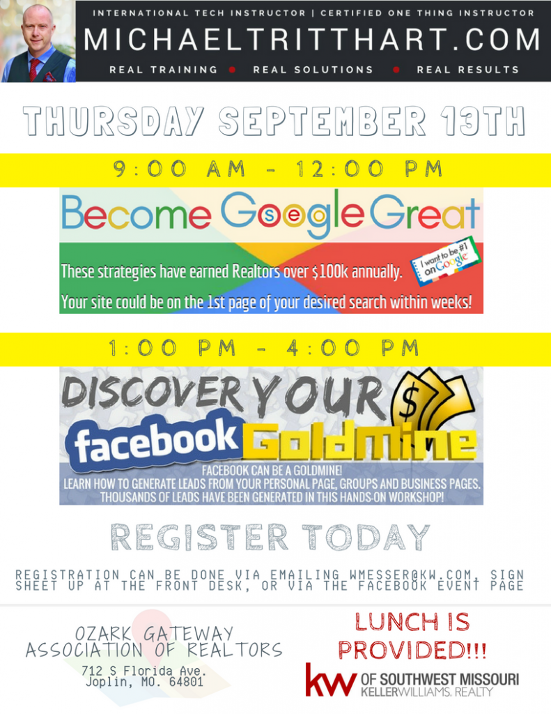 Hosted by Keller Williams Realty of Southwest Missouri Thursday, September 13th 9:00 am - 12:00 pm Become Google Great This class has generated agents over $100k annually and has ranked … Continue reading Discover Your Facebook Goldmine & Become Google Great [Joplin, MO]
