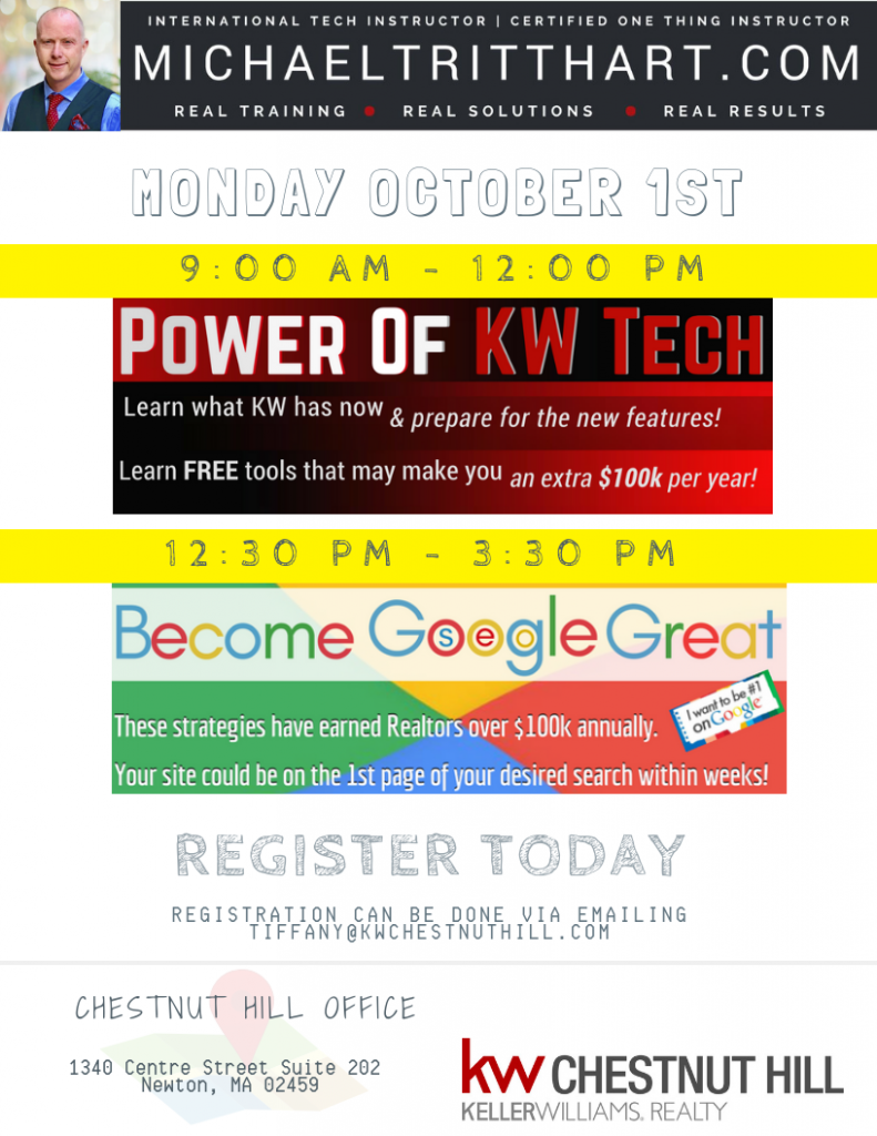 Hosted by KW Chestnut Hill Monday, October 1 9:00 am – 12:00 pm Power of KW Tech Learn what KW has now, prepare for the new features of the Kellies. … Continue reading Power Of KW Tech and Become Google Great and Power Of KW Tech [Newton, MA]