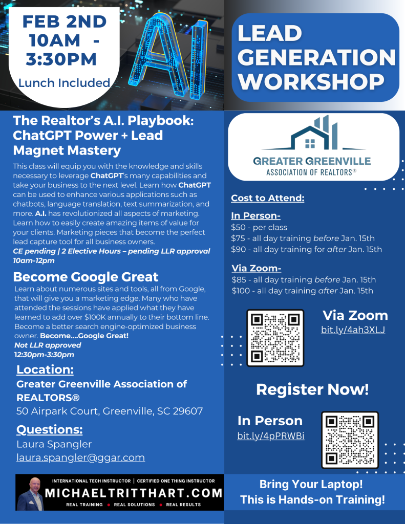 Day 2: This class helps every level of agent get set up and ready for business on the internet. During day two, we discuss what “Going Google” is all about, myTransactions, KWLS, your KW Websites/IDX and all new KW Technology Systems.
