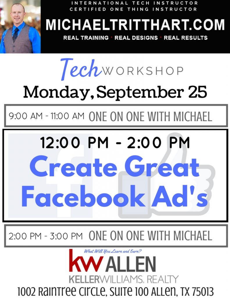 Host: Keller Williams Allen Date: Monday, September 25 Schedule: 9:00 am - 11:00 am One on Ones 12:00 pm - 2:00 pm Create Great Facebook Ads 2:00 pm - 3:00 pm One on … Continue reading Create Great Facebook Ads