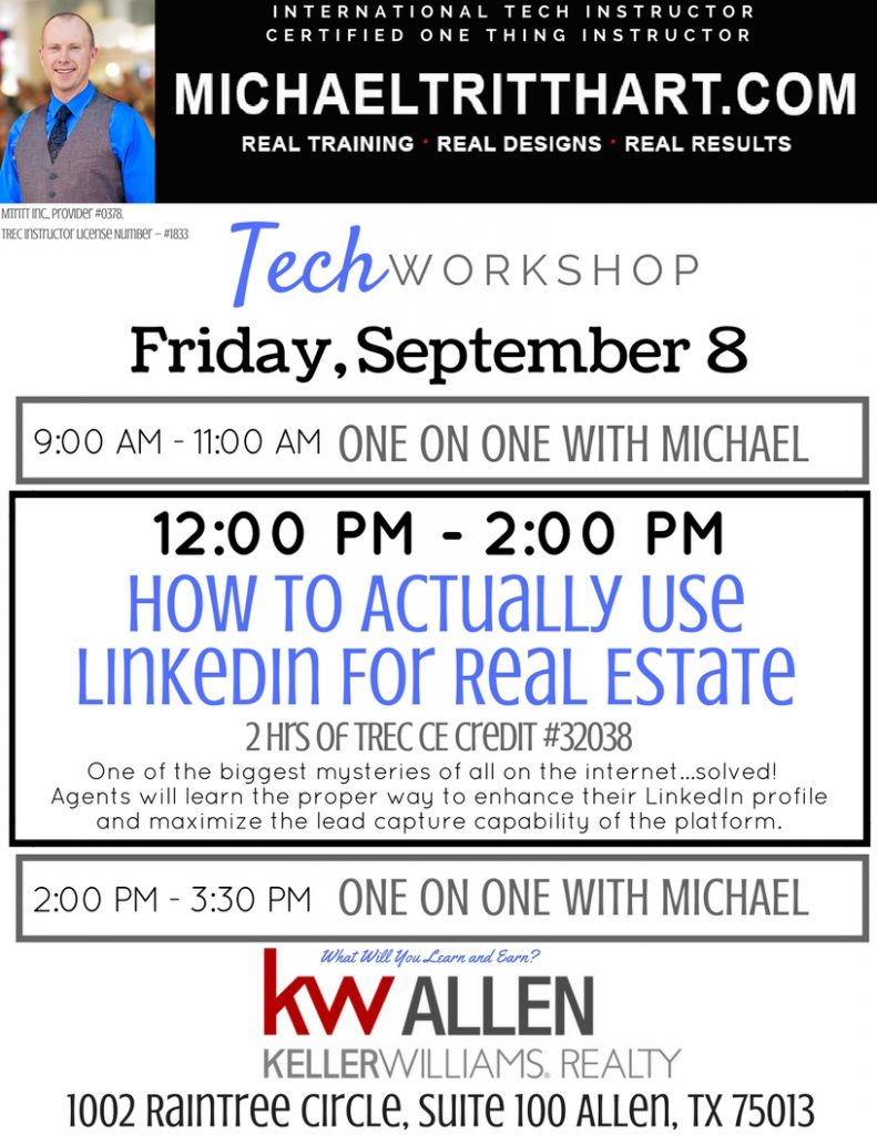 Host: Keller Williams Allen Date: Friday, September 8 Schedule: 9:00 am - 11:00 am One on Ones 12:00 pm - 2:00 pm How to Actually Use LinkedIn For Real Estate | Two hours … Continue reading How to Actually Use LinkedIn For Real Estate