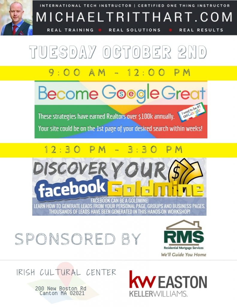 Hosted by Keller Williams Easton Tuesday, October 2 9:00 am – 12:00 pm Become Google Great This class has generated agents over $100k annually and has ranked agents on the 1st page … Continue reading Become Google Great and Facebook Goldmine [Easton, MA]