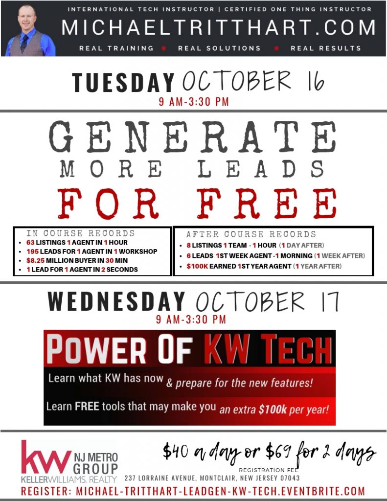 Hosted by Keller Williams NJ Tuesday, October 16- Wednesday October 17 Power of KW Tech Learn what KW has now, prepare for the new features of the Kellies. Learn FREE tools … Continue reading Power Of KW Tech and Generate More Leads For FREE [Montclair, NJ]
