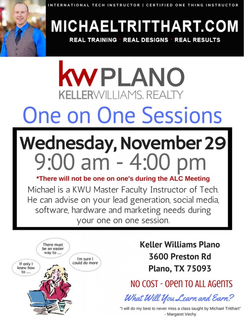 Host: Keller Williams Plano Date: Wednesday, November 29 Schedule: 9:00 am - 4:00 pm One on One Sessions Location: 3600 Preston Rd. Plano, TX 75093 Click here to schedule a Tech … Continue reading One On One Sessions
