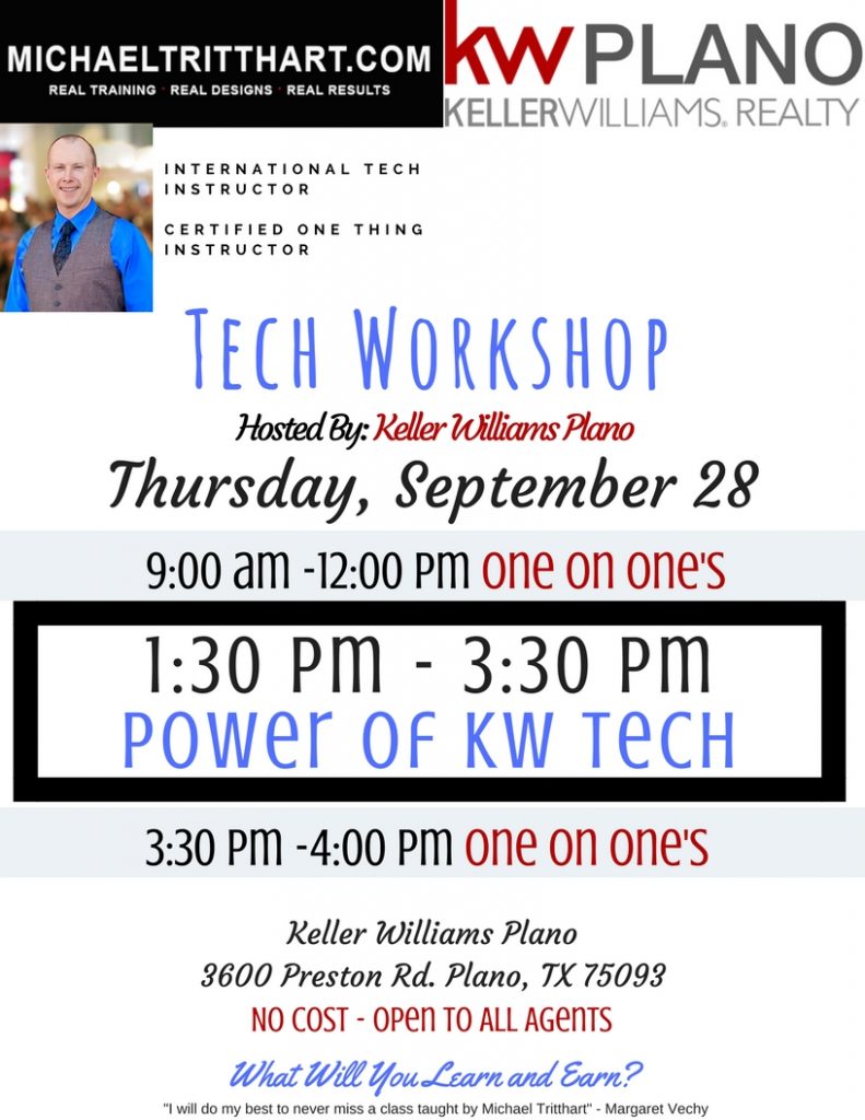 Host: Keller Williams Plano Date: Thursday, September 28 Time/Topic: 9:00 am - 12:00 pm One on One Sessions 1:30 pm - 3:30 pm Power of KW Tech 3:30 pm - … Continue reading Power of KW Tech
