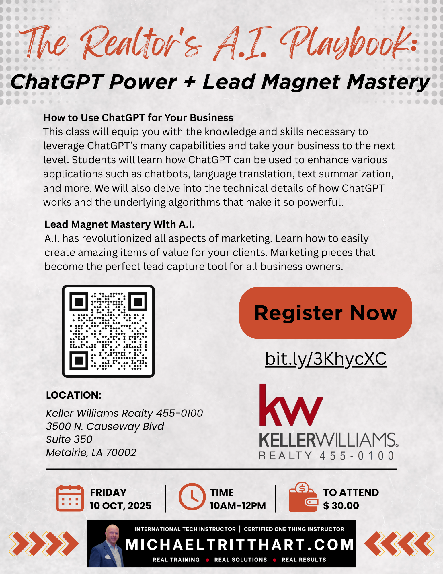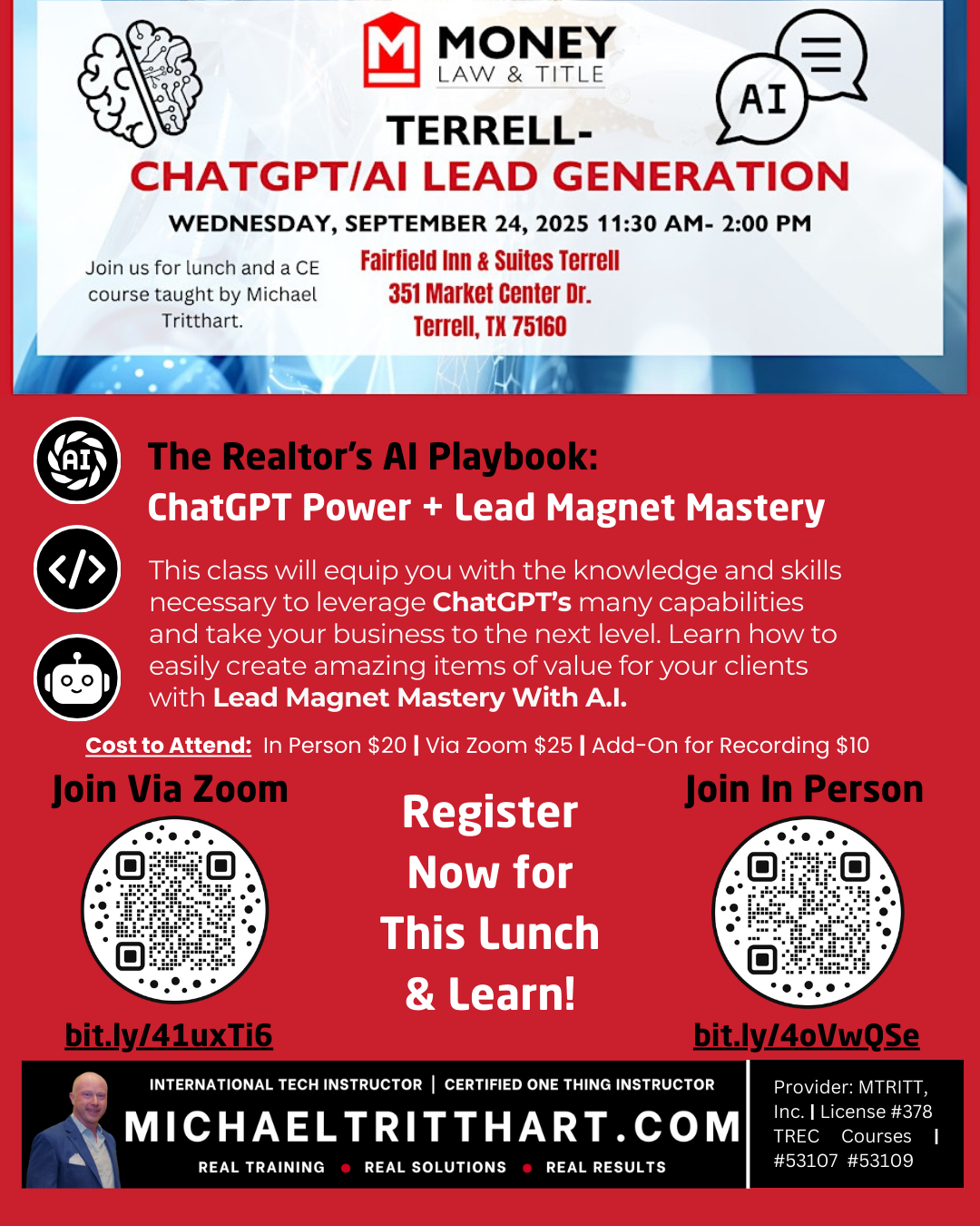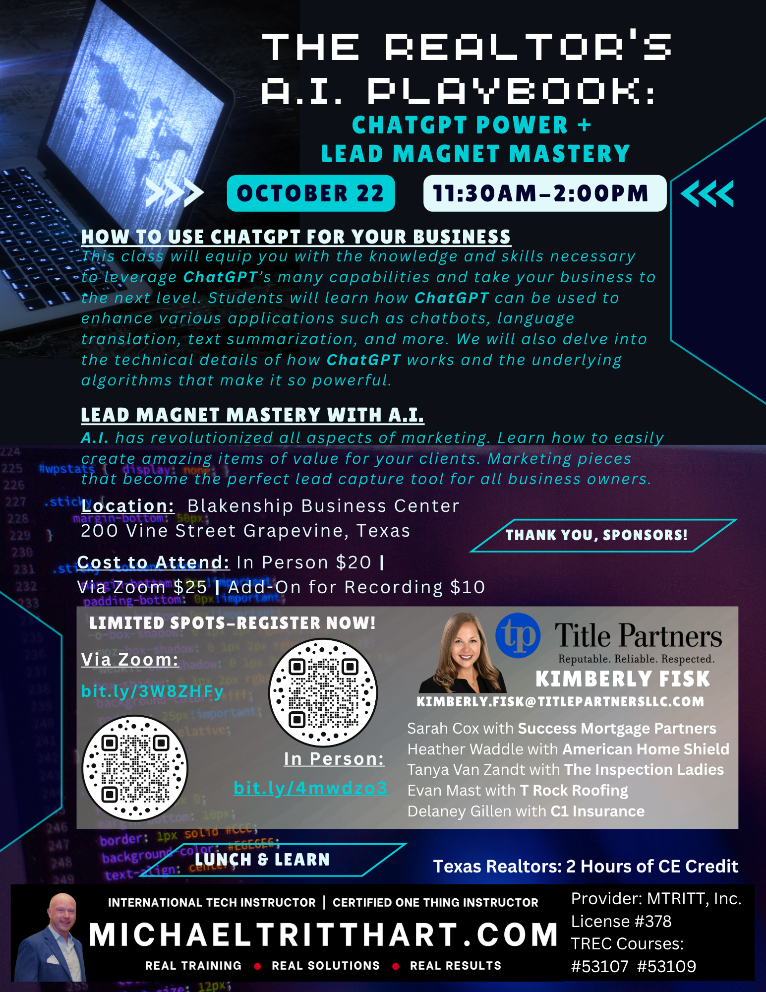 Forney Economic Development Corporation 210 S Bois D'Arc, Forney, United StatesStewart Title - Forney is pleased to bring you a Michael Tritthart Business Building Workshop - The Realtor’s AI Playbook: ChatGPT Power + Lead Magnet Mastery How to Use ChatGPT for Your Business This class will equip you with the knowledge and skills necessary to leverage ChatGPT’s many capabilities and take your business to the next level. Students […]