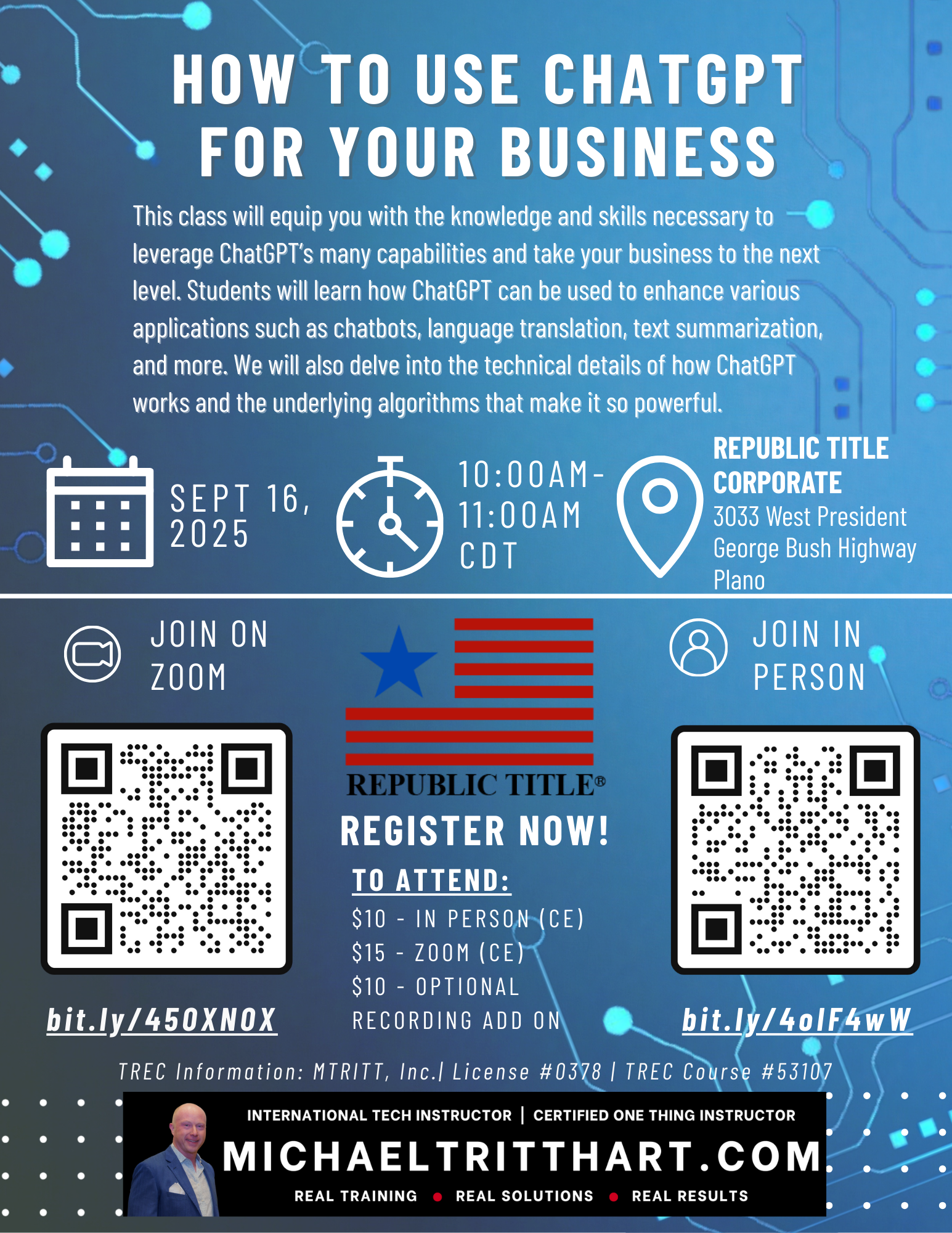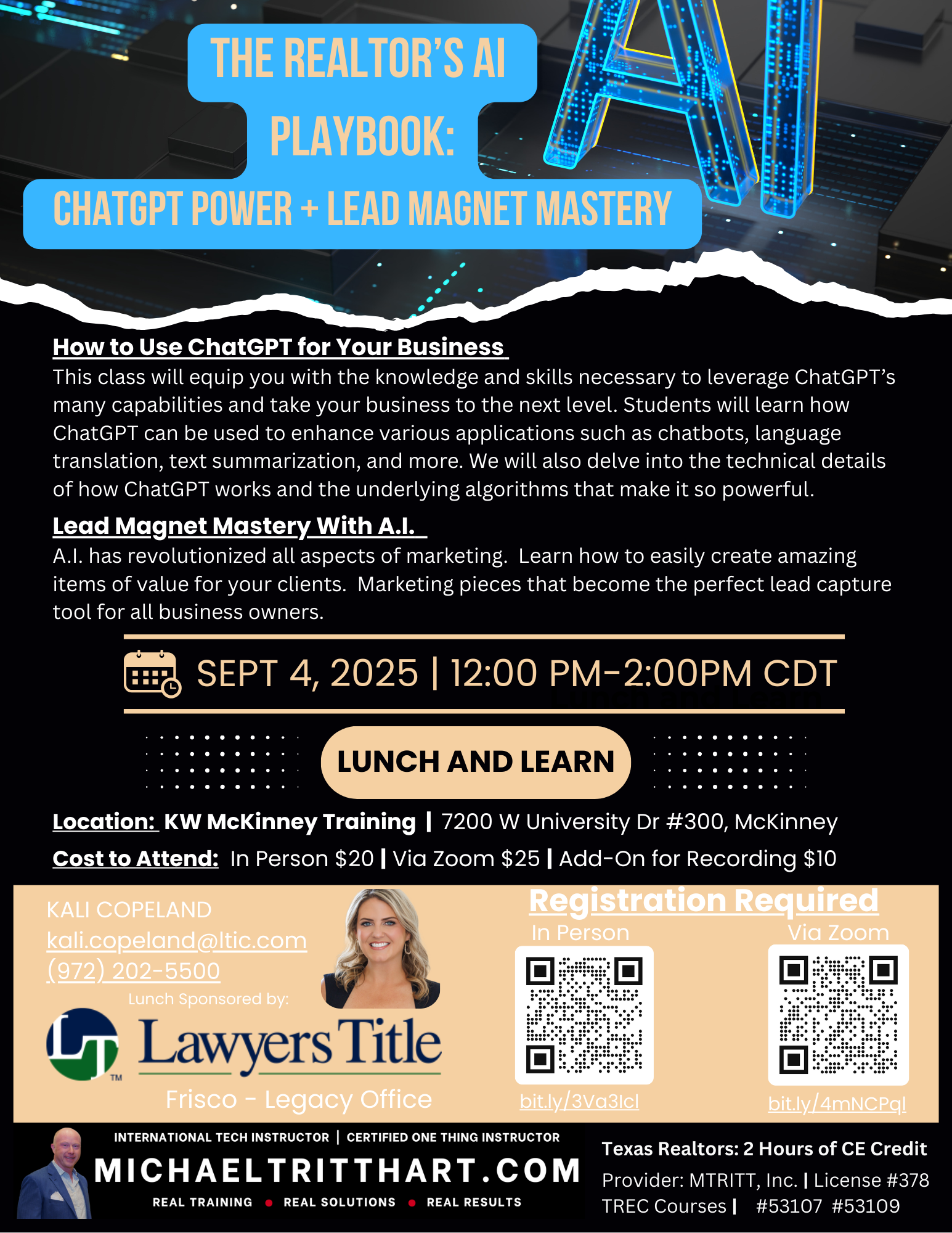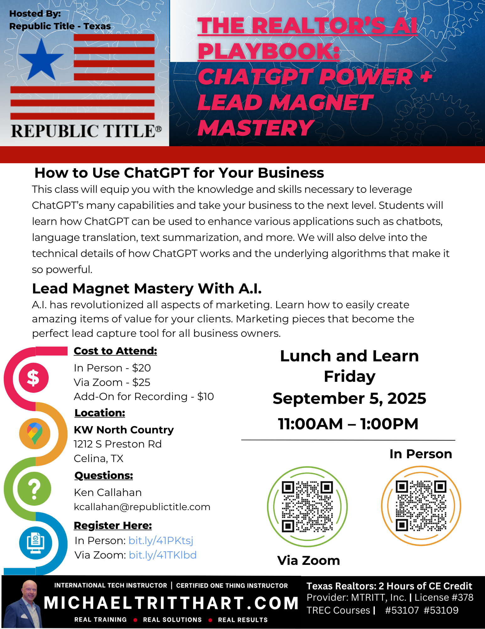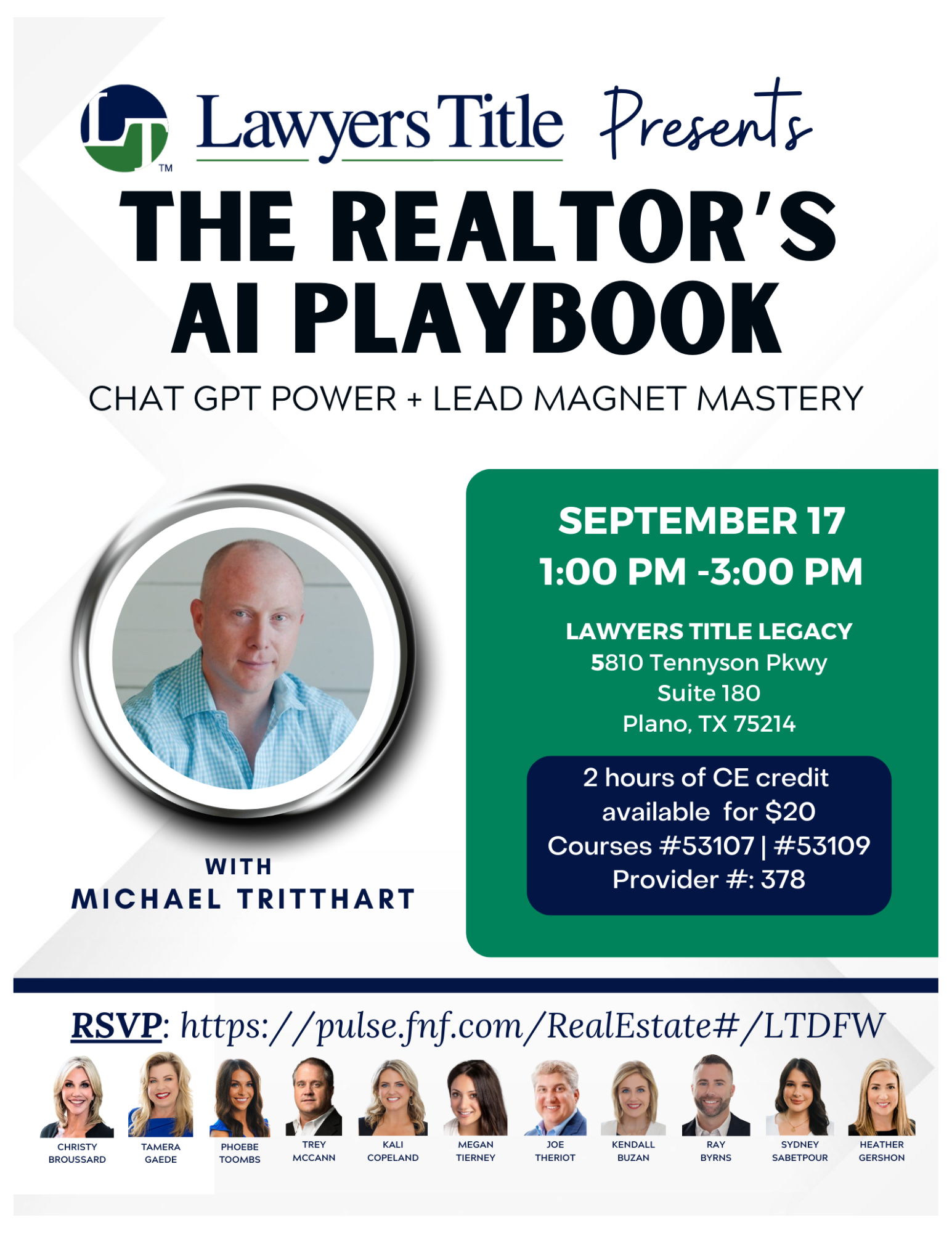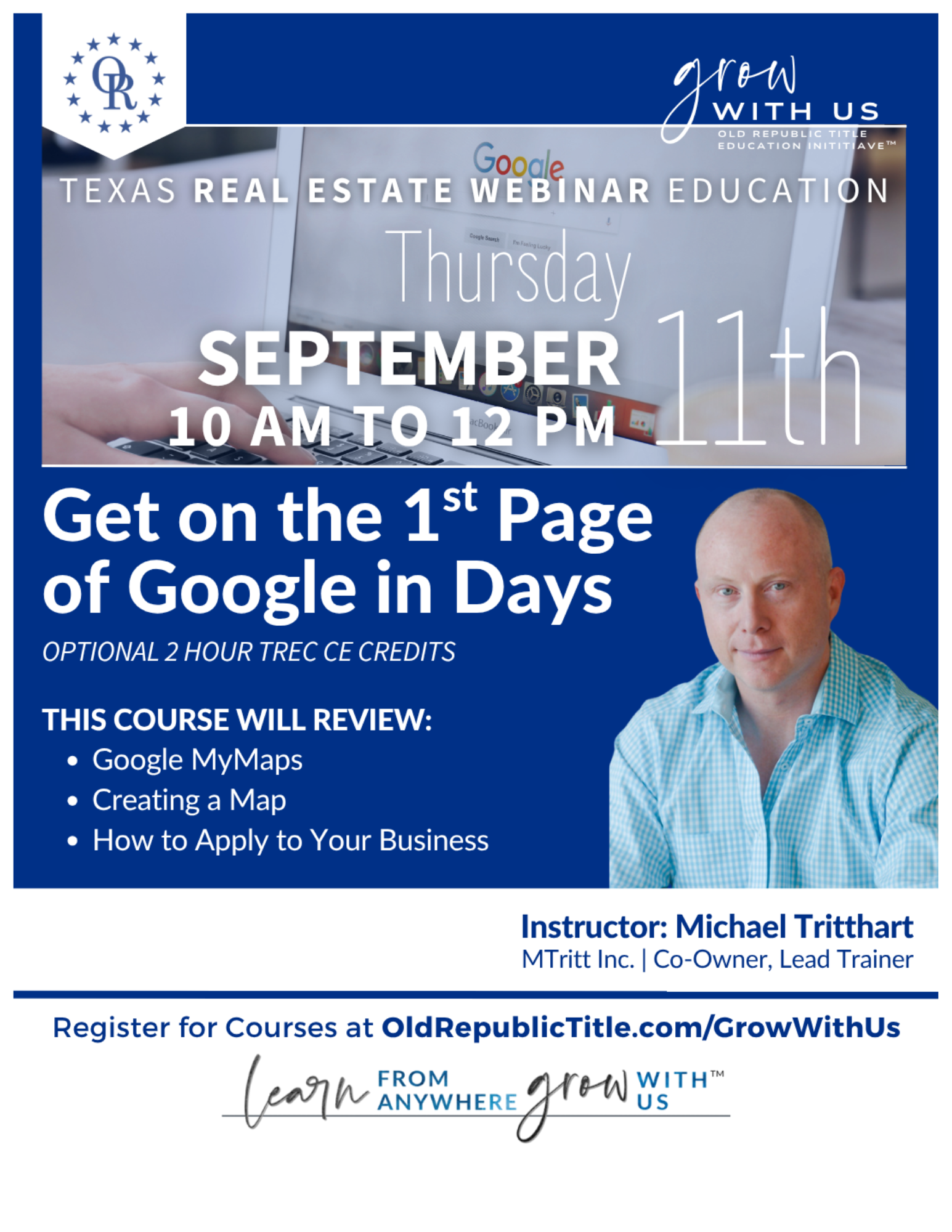 Lawyers Title DFW is pleased to present a Michael Tritthart Training Workshop: $100K Annually with Google Business Profile! A Google Business Profile is the most essential element for your business. This 2-hour workshop will allow you to completely set up your account the right way. Business owners have made over $100k annually from doing this. Attend […]