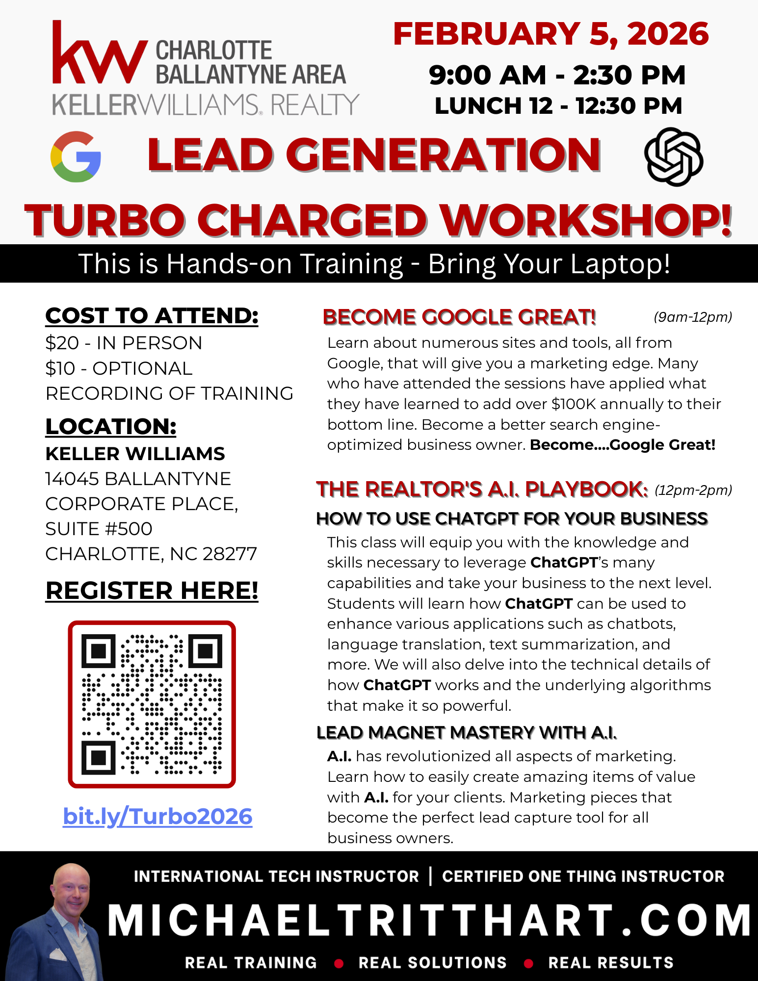 Feb 5 9:00 am - 2:00 pm Lead Generation-Turbo Charged Workshop | KW Charlotte/Ballantyne KW Charlotte/Ballantyne Area 14045 Ballantyne Corporate Pl, Charlotte Event Details Get Directions