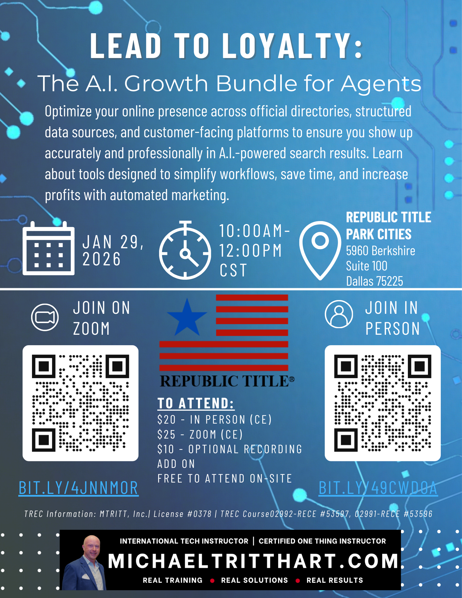 Jan 29 10:00 am - 12:00 pm Lead to Loyalty: The A.I. Growth Bundle for Agents | Republic Title | Dallas, TX or Via Zoom Republic Title Park Cities 5960 Berkshire Suite 100, Dallas Event Details Get Directions