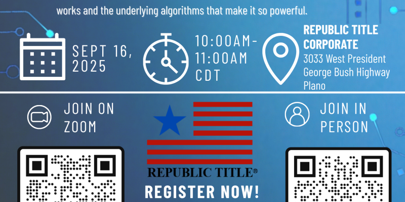 Location: Republic Title of Texas | 3033 West President George Bush Highway, First Floor Conference Room, Plano 75075 | or Via Zoom