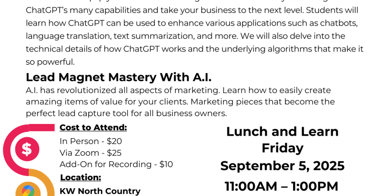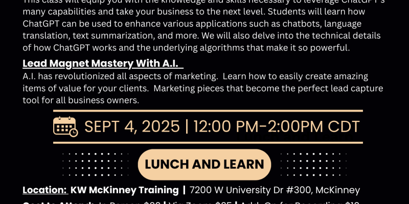This class will equip you with the knowledge and skills necessary to leverage ChatGPT’s many capabilities and take your business to the next level. Students will learn how ChatGPT can be used to enhance various applications such as chatbots, language translation, text summarization, and more. We will also delve into the technical details of how ChatGPT works and the underlying algorithms that make it so powerful.