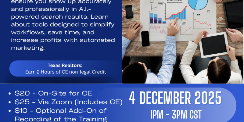 In today’s fast-moving market, real estate agents and small business owners need to do more with less. This workshop introduces the power of Smarter Business with A.I. – a set of A.I.-driven tools designed to simplify workflows, save time, and increase profits. All while providing superior customer service. Through live demos, real-world examples, and guided practice, participants will learn how to automate marketing, client follow-ups, scheduling, and more. Attendees will walk away with practical automations they can immediately implement.