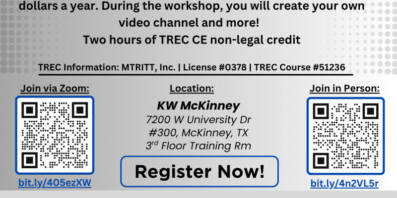 Texas Realtors: Earn 2 Hours of CE non-legal Credit – A Zoom link will be sent the morning of the class.