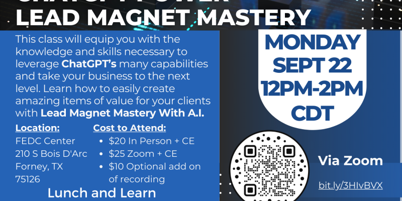 A.I. has revolutionized all aspects of marketing. Learn how to easily create amazing items of value for your clients. Marketing pieces that become the perfect lead capture tool for all business owners.